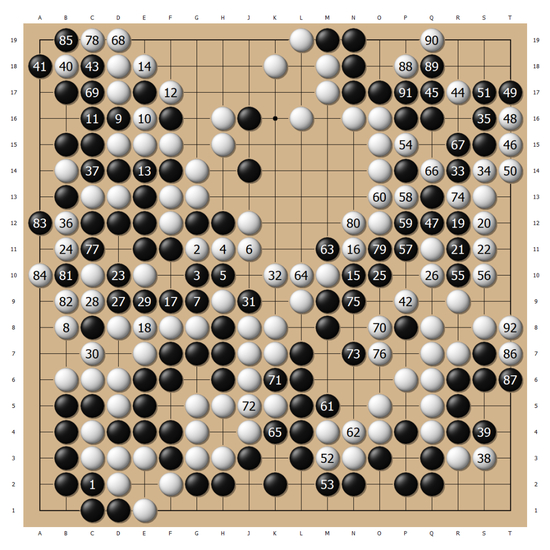 白40挡下时,金志锡此处有点追求过度。韩国三人、白棋只能外围寻求补偿。